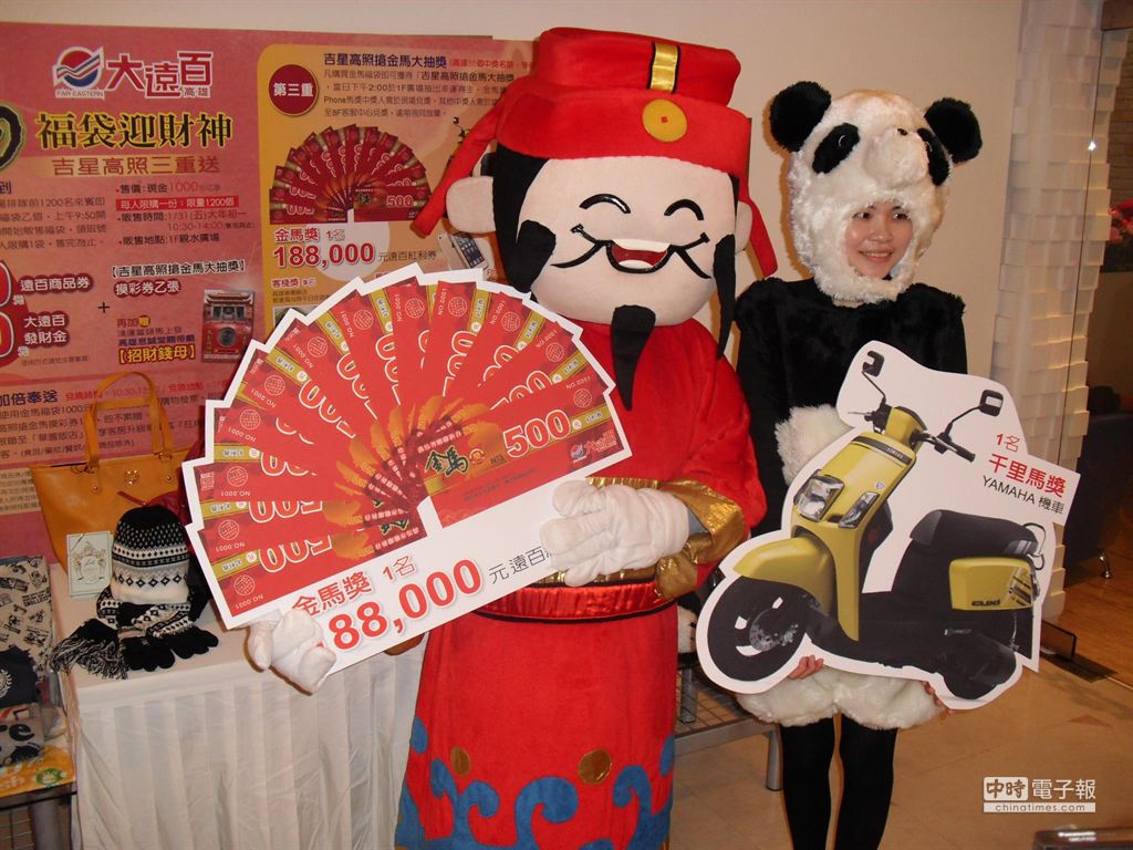 臺(tái)灣高雄百貨大遠(yuǎn)百大年初一推1000元福袋,年初二憑3000元發(fā)票加價(jià)88元讓熊貓玩偶陪你回娘家,福袋最大獎(jiǎng)18萬8000元商品紅利券。